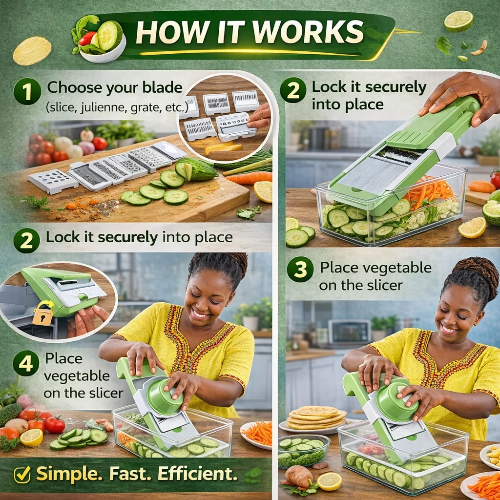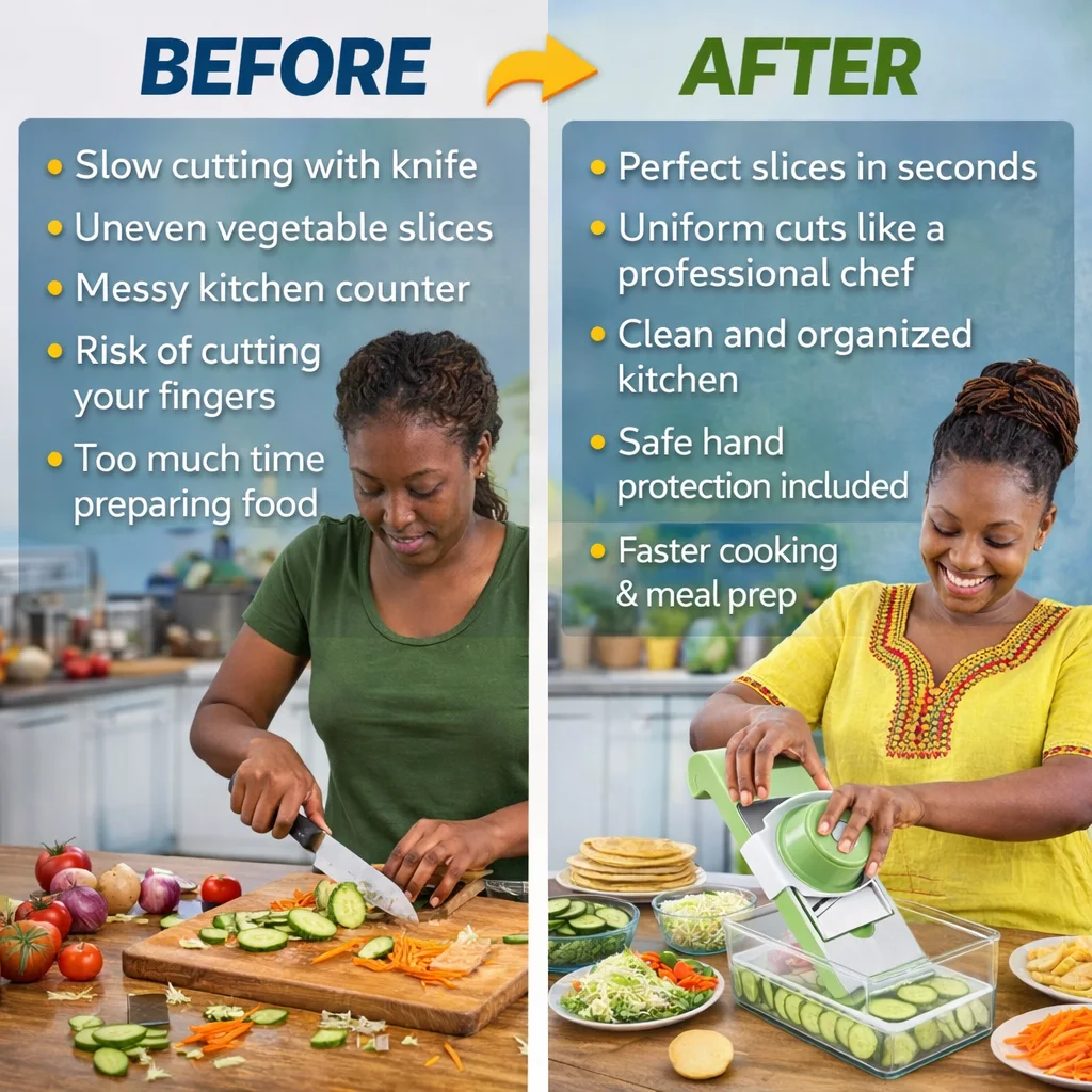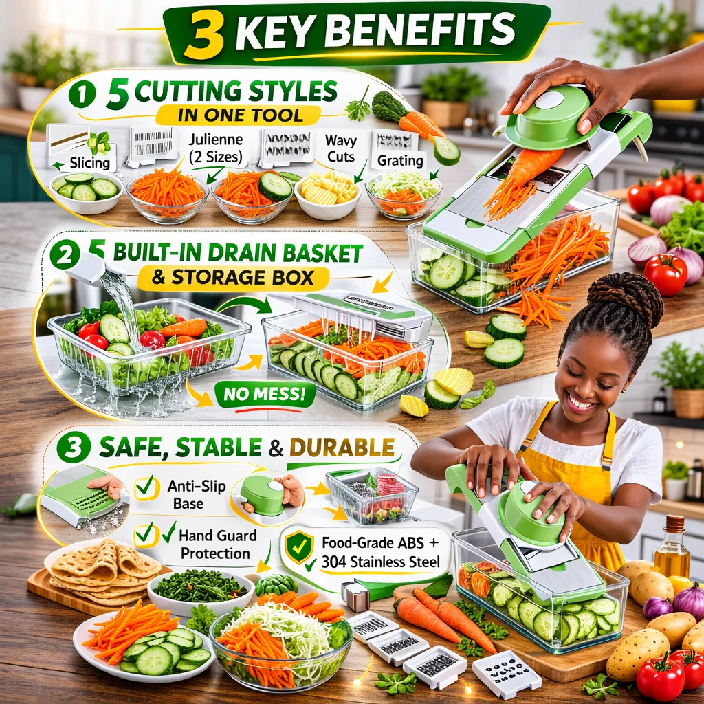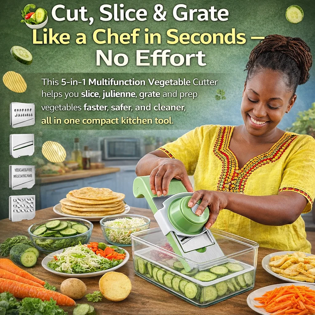 This 5-in-1 Multifunction Vegetable Cutter helps you slice, julienne, grate and prep vegetables faster, safer, and cleaner — all in one compact kitchen tool.