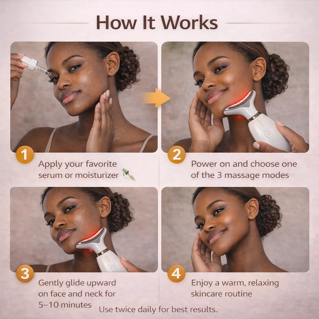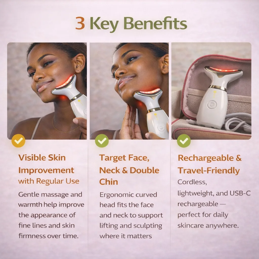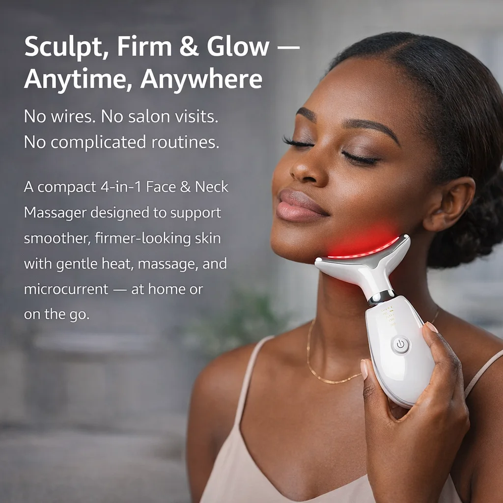 A compact 4-in-1 Face & Neck Massager designed to support smoother, firmer-looking skin with gentle heat, massage, and microcurrent — at home or on the go.