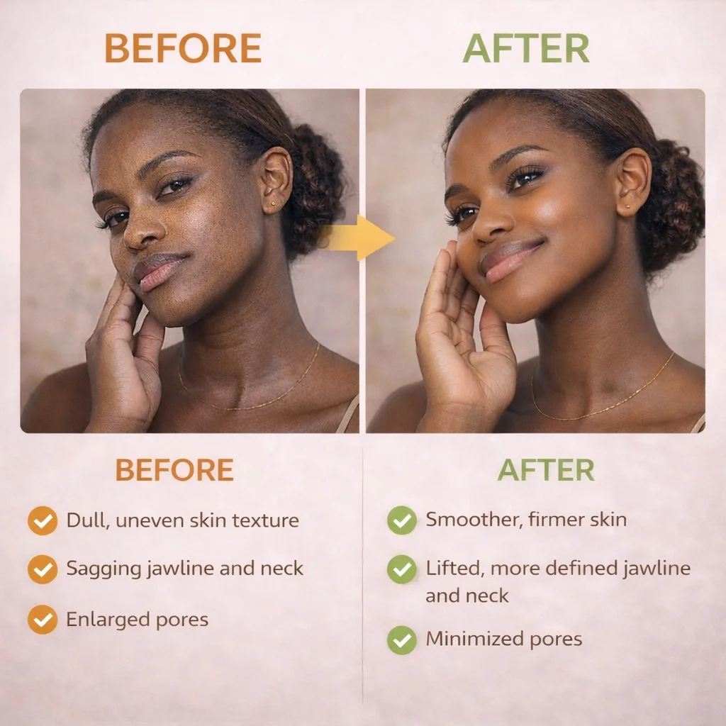 • Firmer-looking face and neck with regular use
