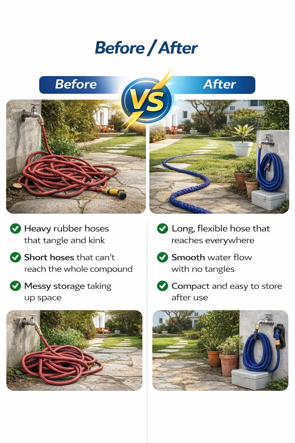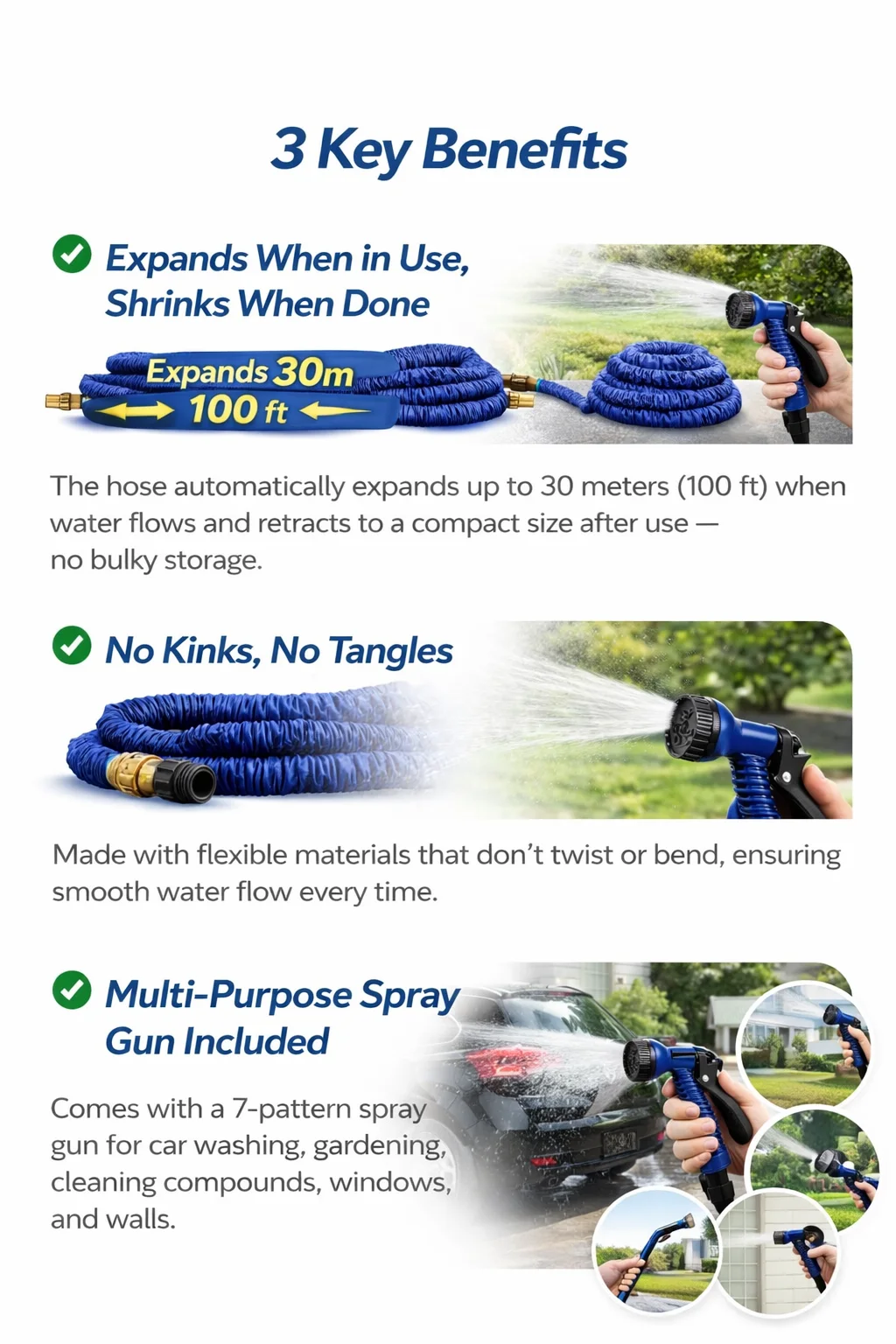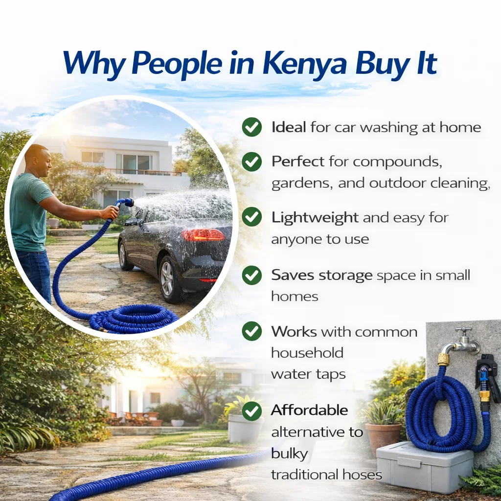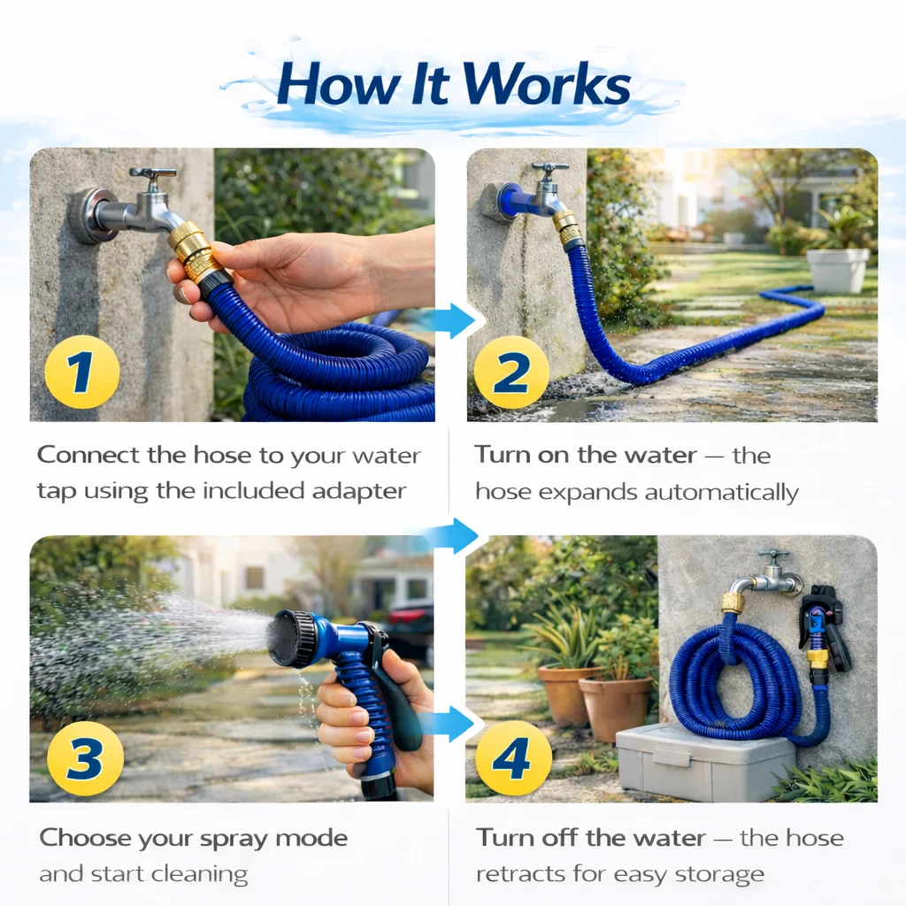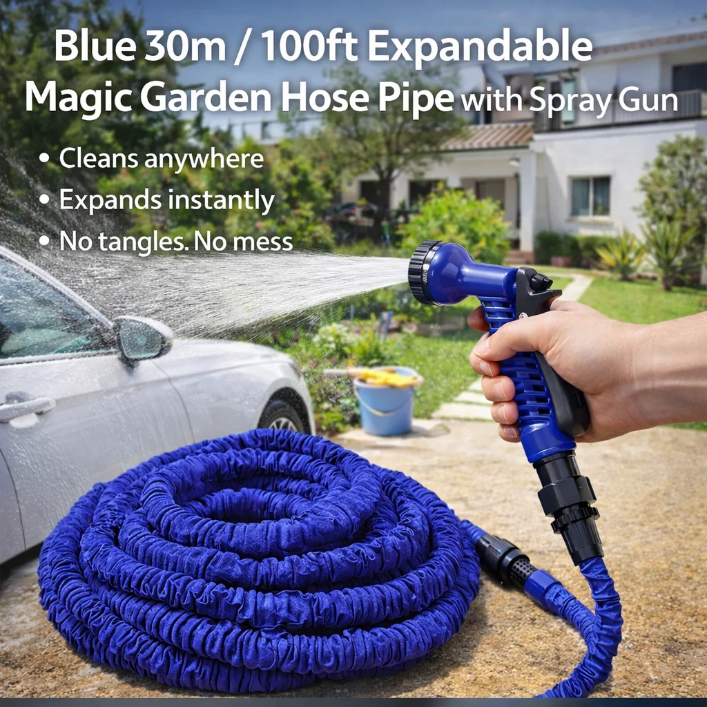 A lightweight, flexible expandable hose that grows up to 3× its size with water pressure, then shrinks back for easy storage — perfect for home compounds, car washing, and garden use.
