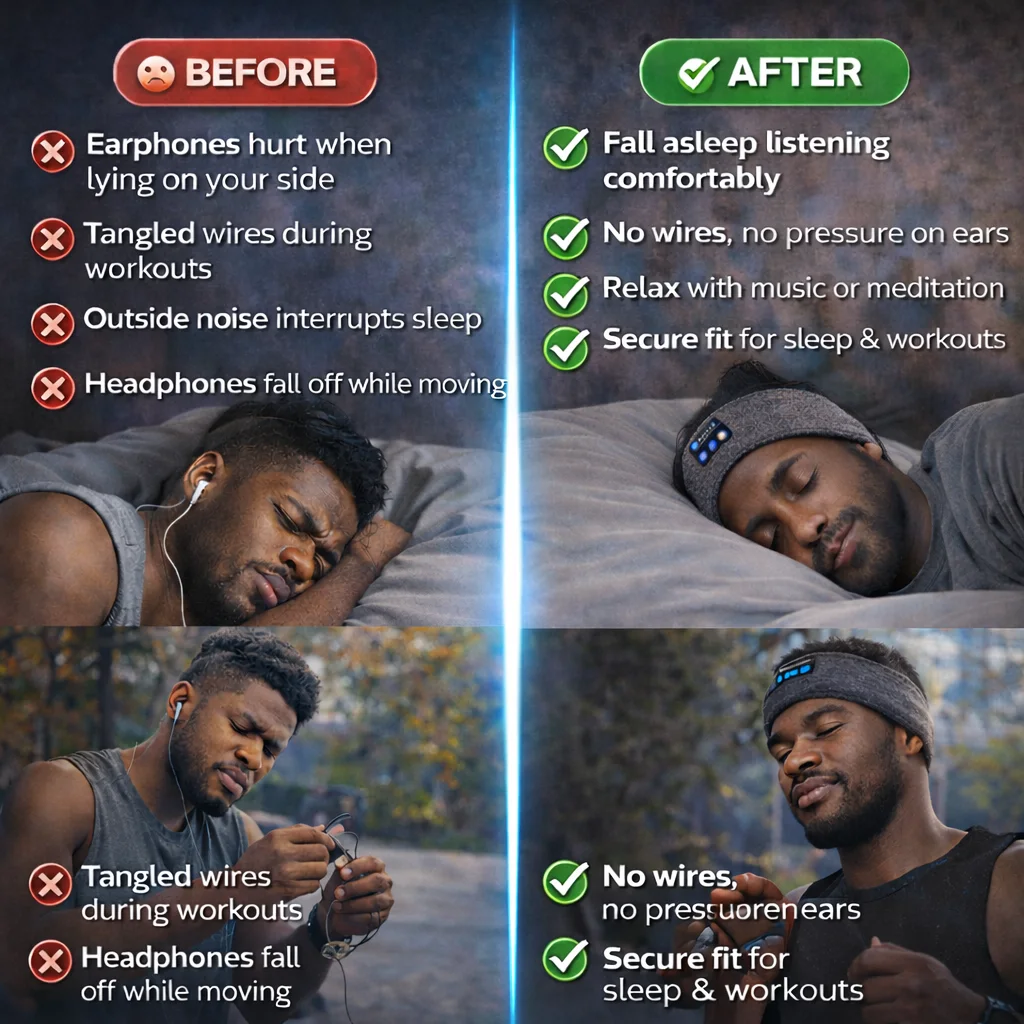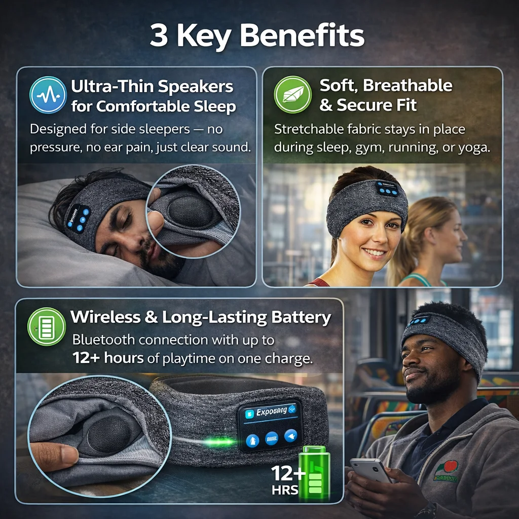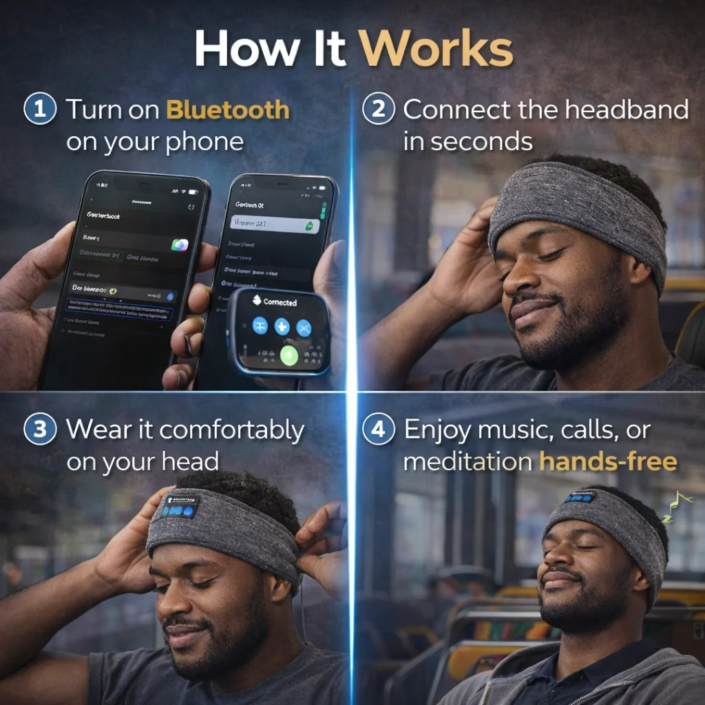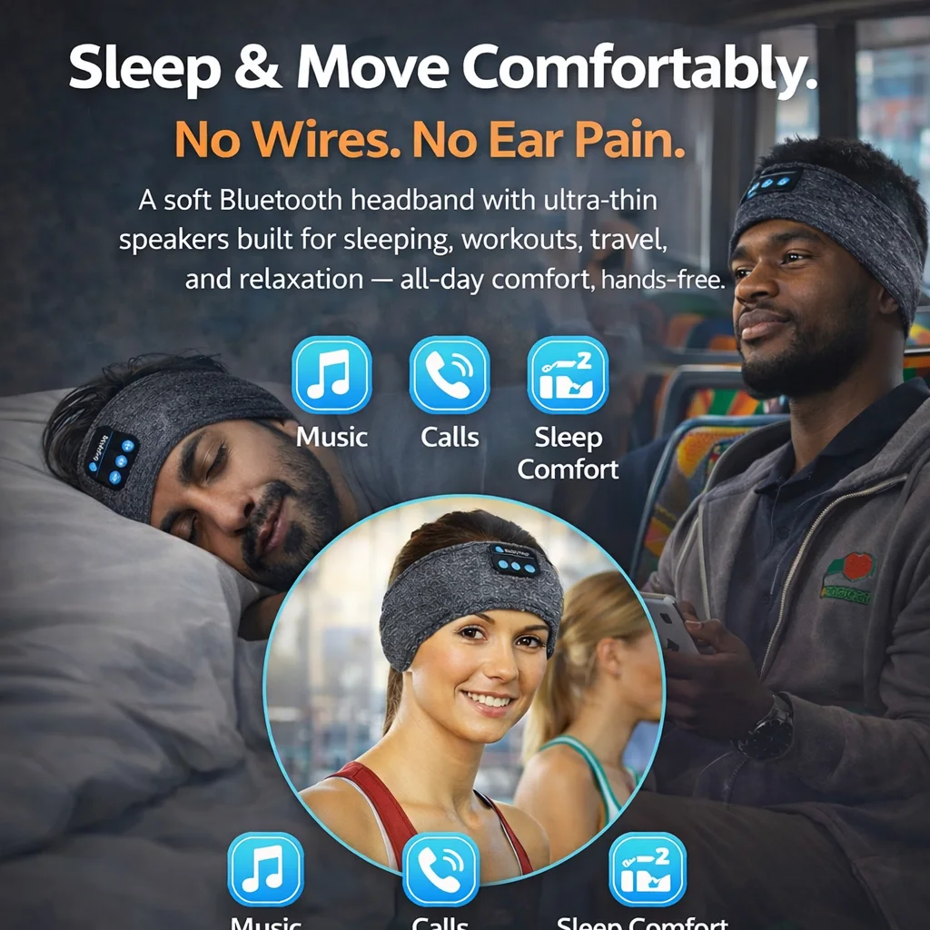 A soft Bluetooth headband with ultra-thin speakers built for sleeping, workouts, travel, and relaxation — all-day comfort, hands-free.