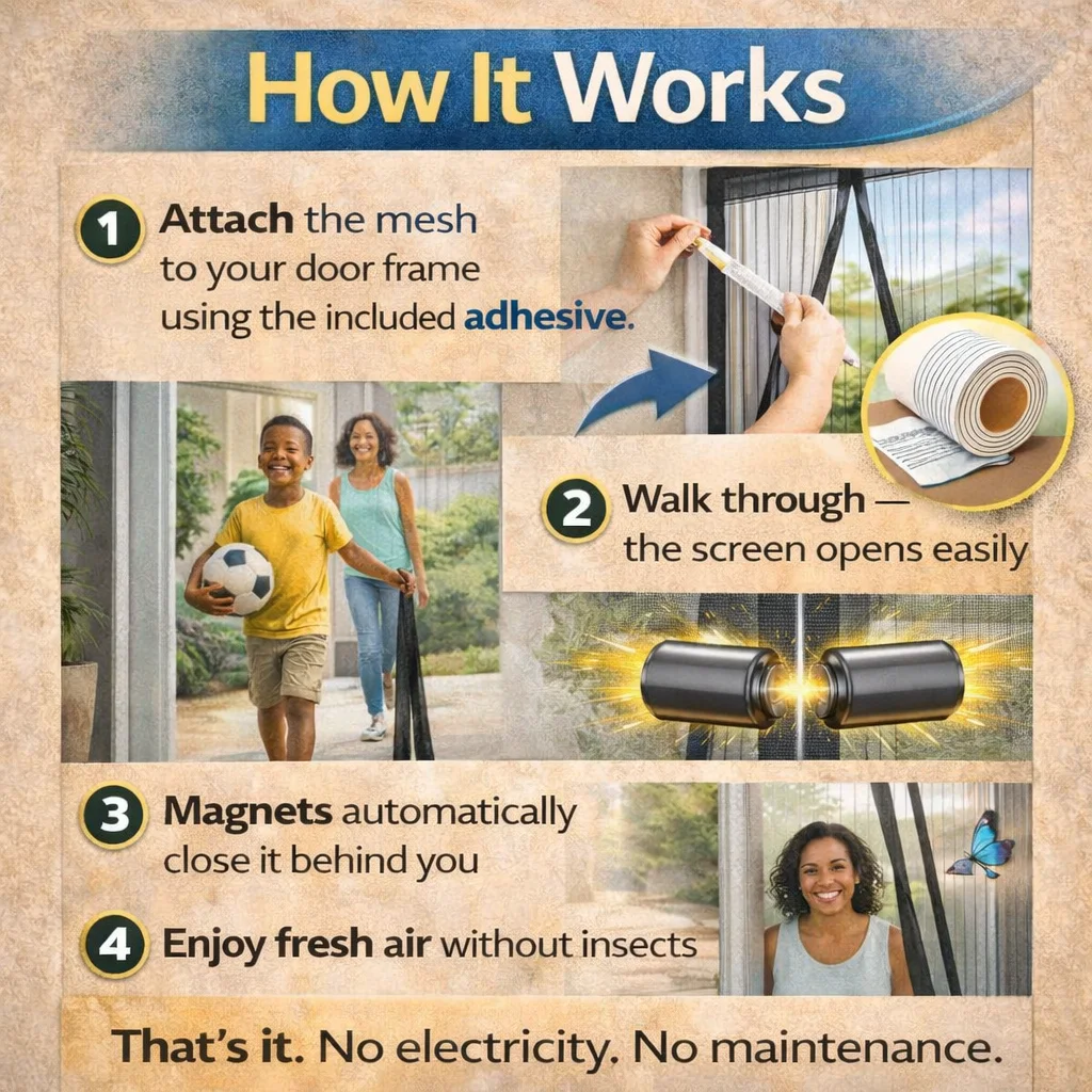 1️- Attach the mesh to your door frame using the included adhesive