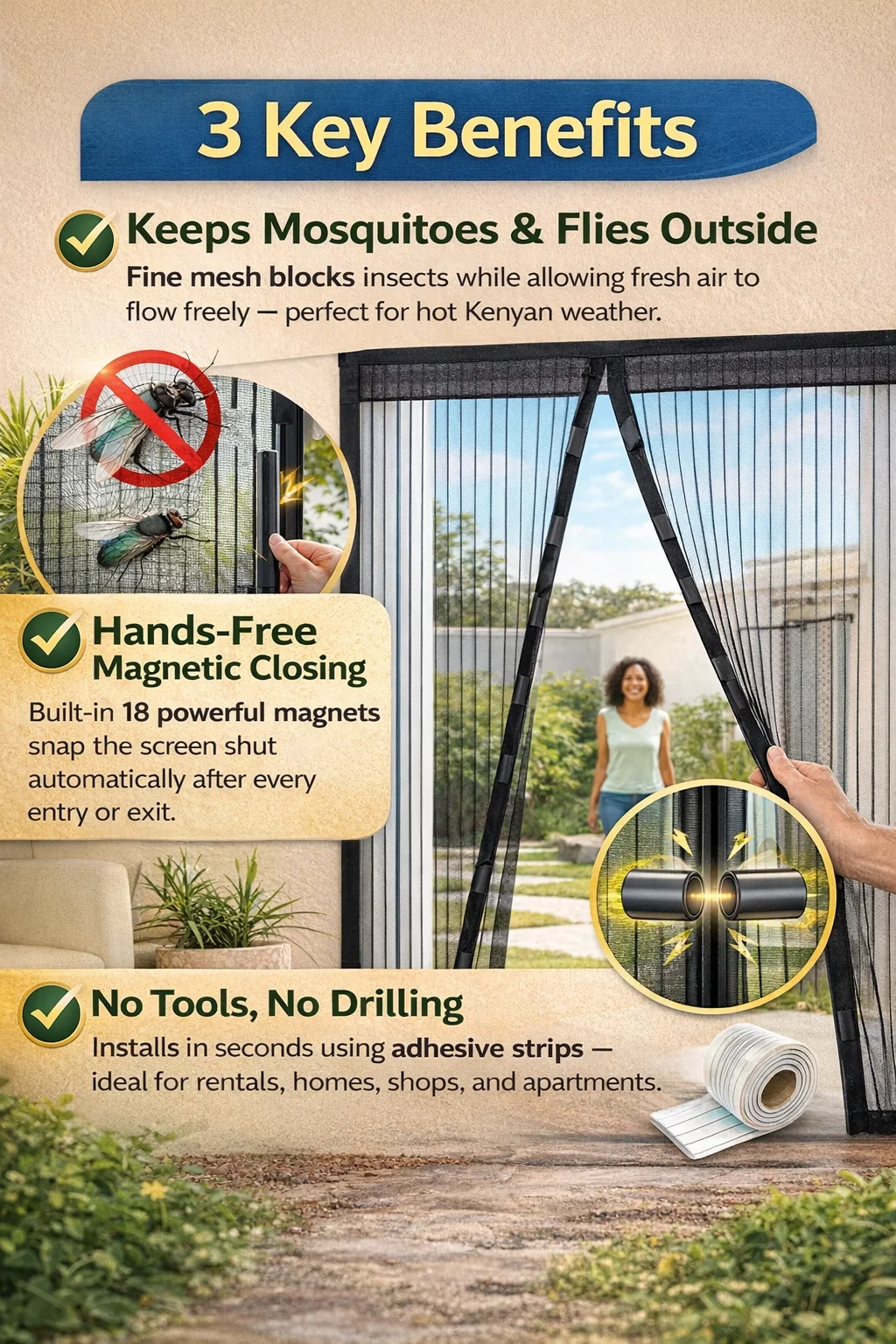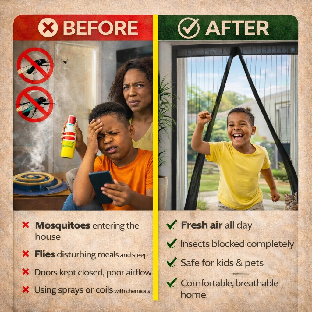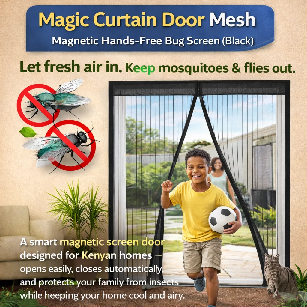 A smart magnetic screen door designed for Kenyan homes — opens easily, closes automatically, and protects your family from insects while keeping your home cool and airy.