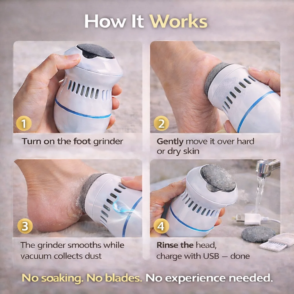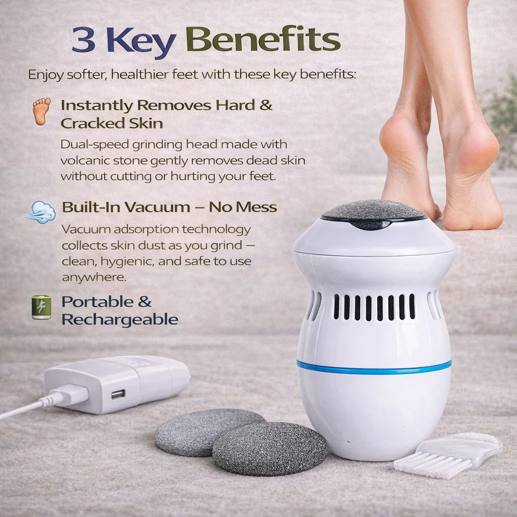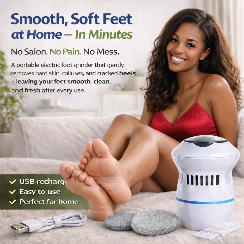 A portable electric foot grinder that gently removes hard skin, calluses, and cracked heels — leaving your feet smooth, clean, and fresh after every use.