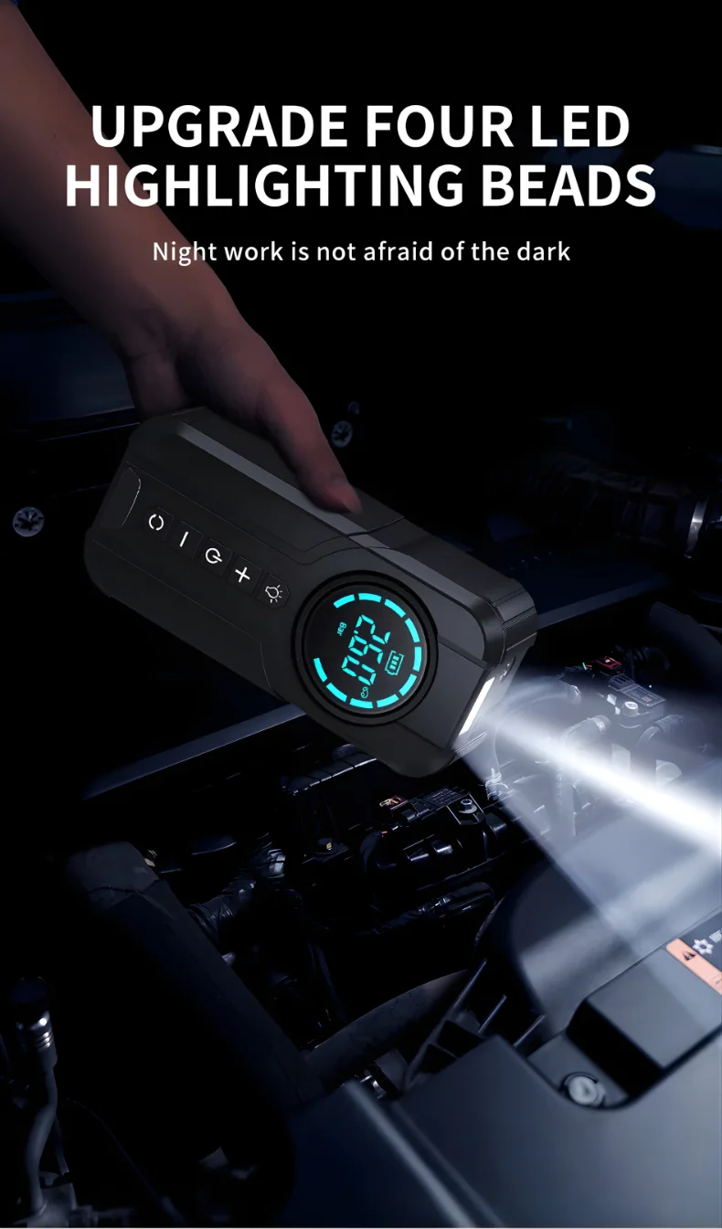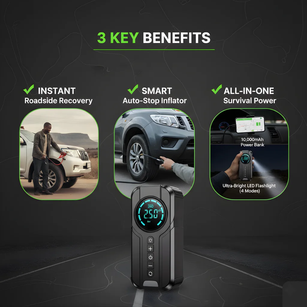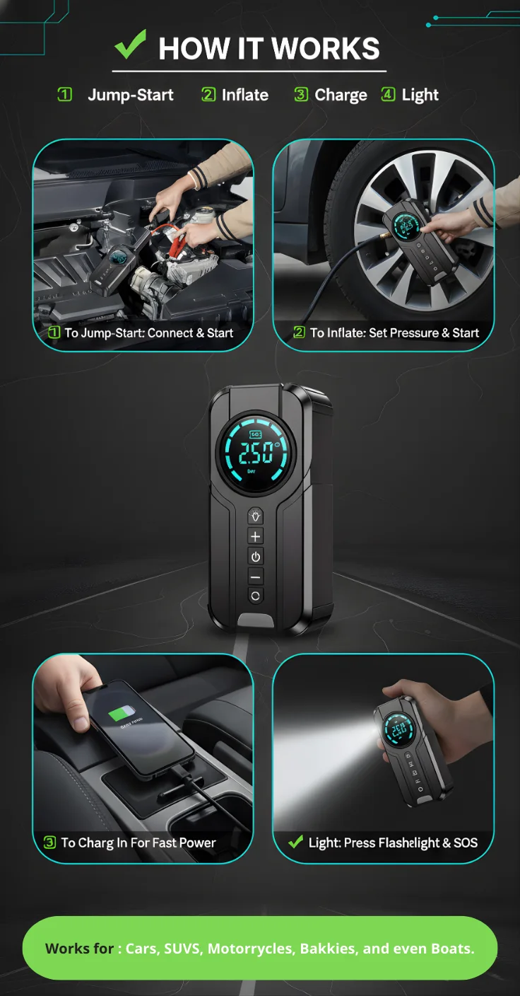 ✔ Built-in smart auto-stop tire inflator, a 10,000mAh power bank, and a 4-mode LED flashlight for emergencies—day or night.