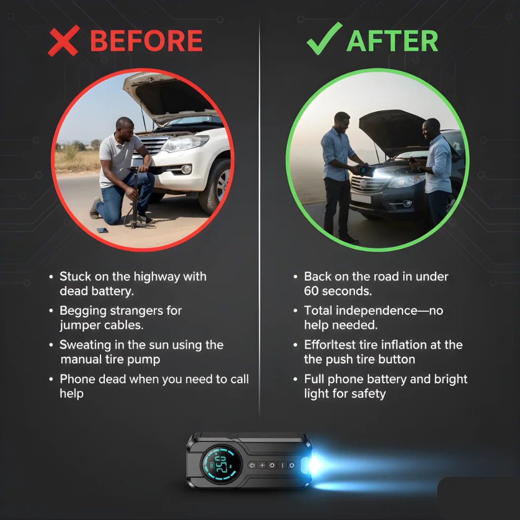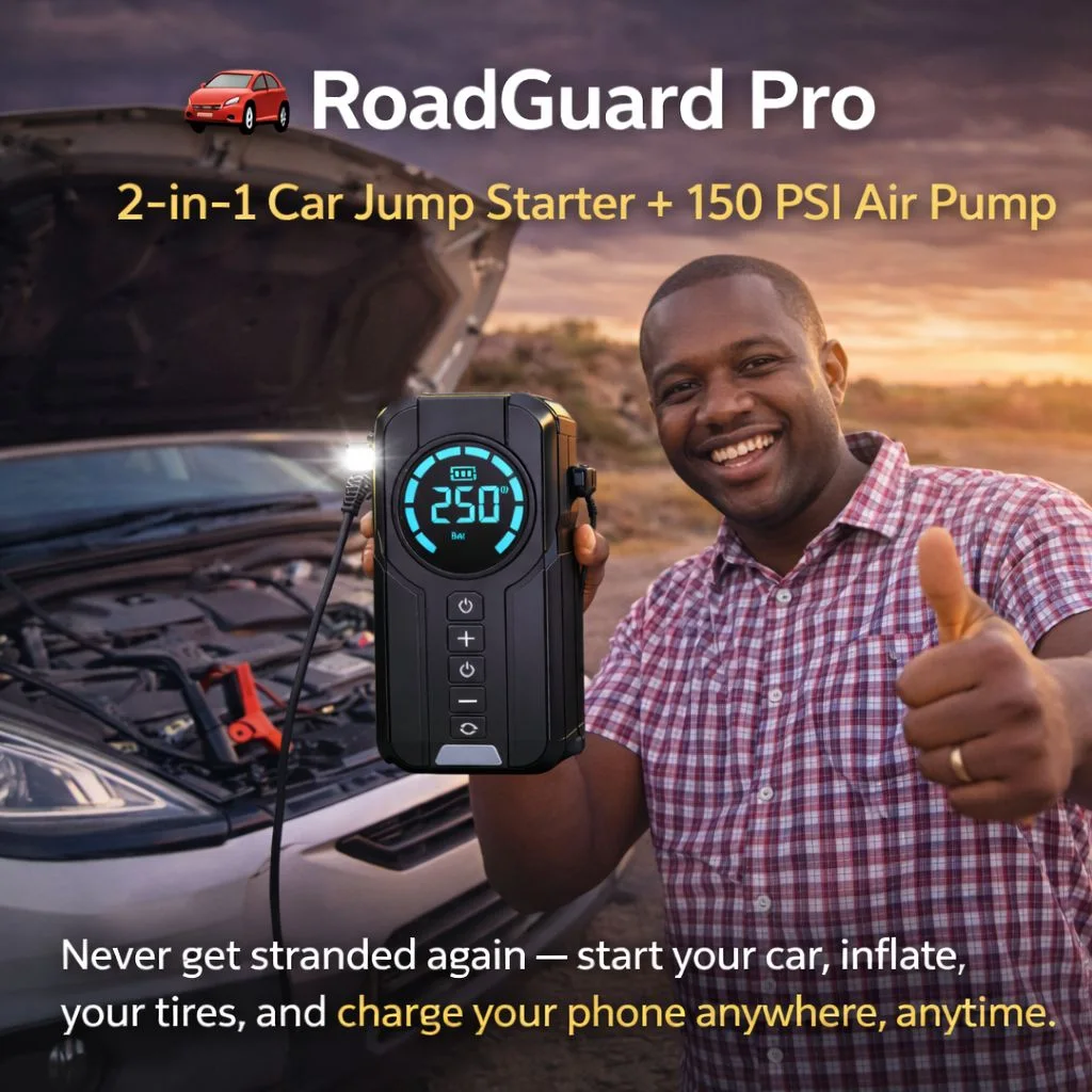 The ultimate 4-in-1 emergency kit that ensures you never get stranded on the road again. Jump-start dead batteries, pump flat tires, and charge your phone with one powerful device.