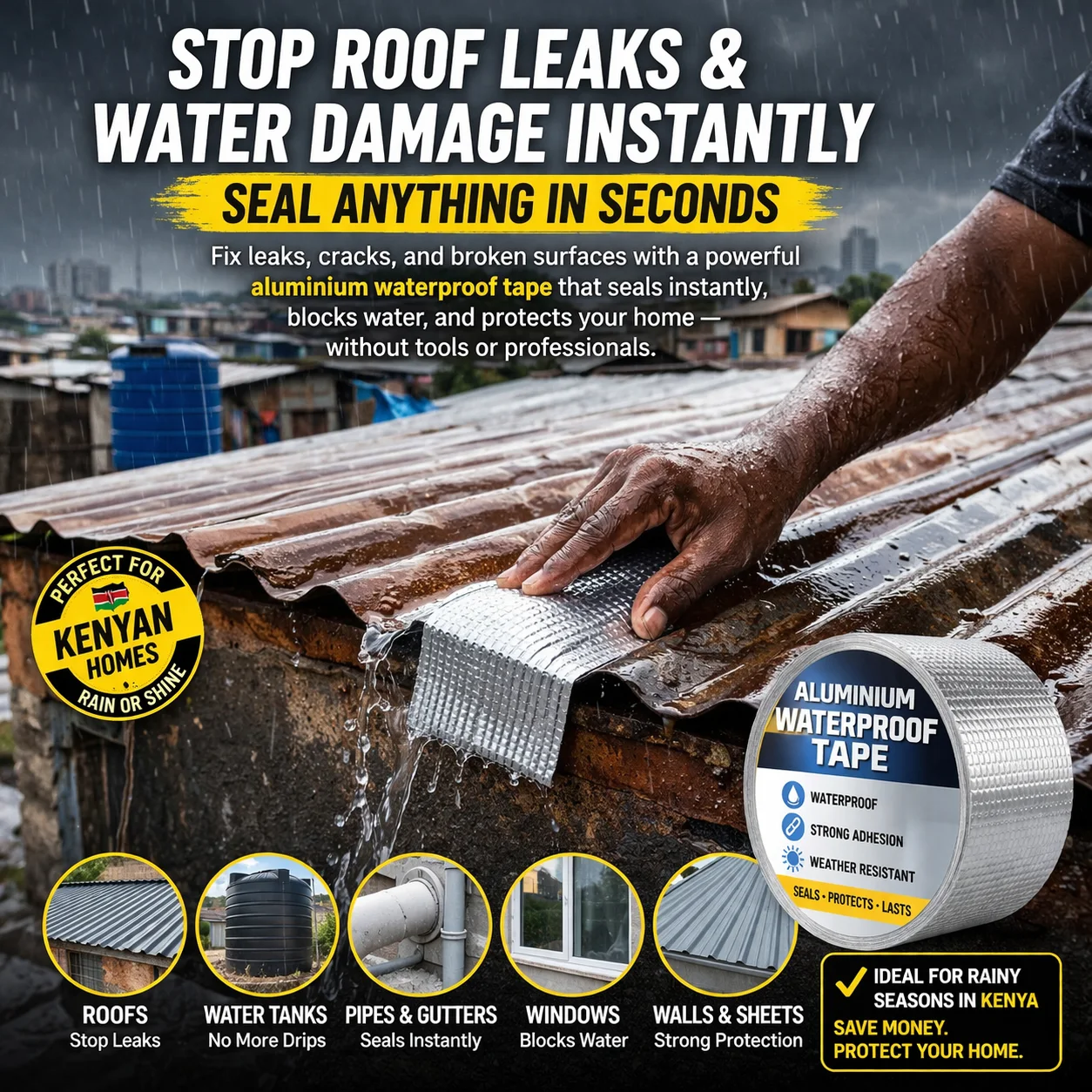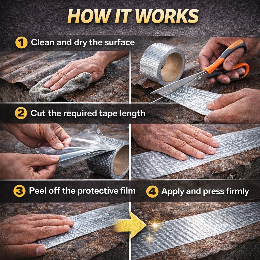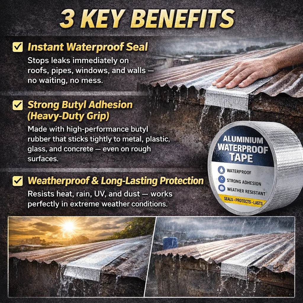 Fix leaks, cracks, and broken surfaces with a powerful aluminium waterproof tape that seals instantly, blocks water, and protects your home — without tools or professionals.