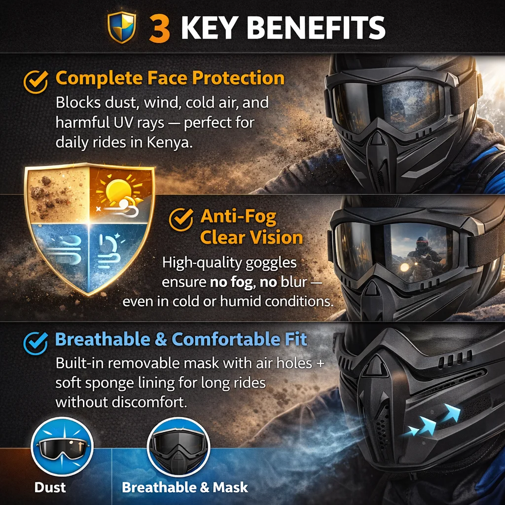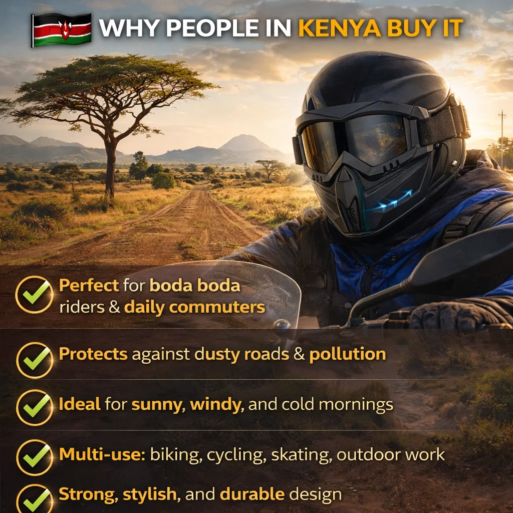 Blocks dust, wind, cold air, and harmful UV rays — perfect for daily rides in Kenya.