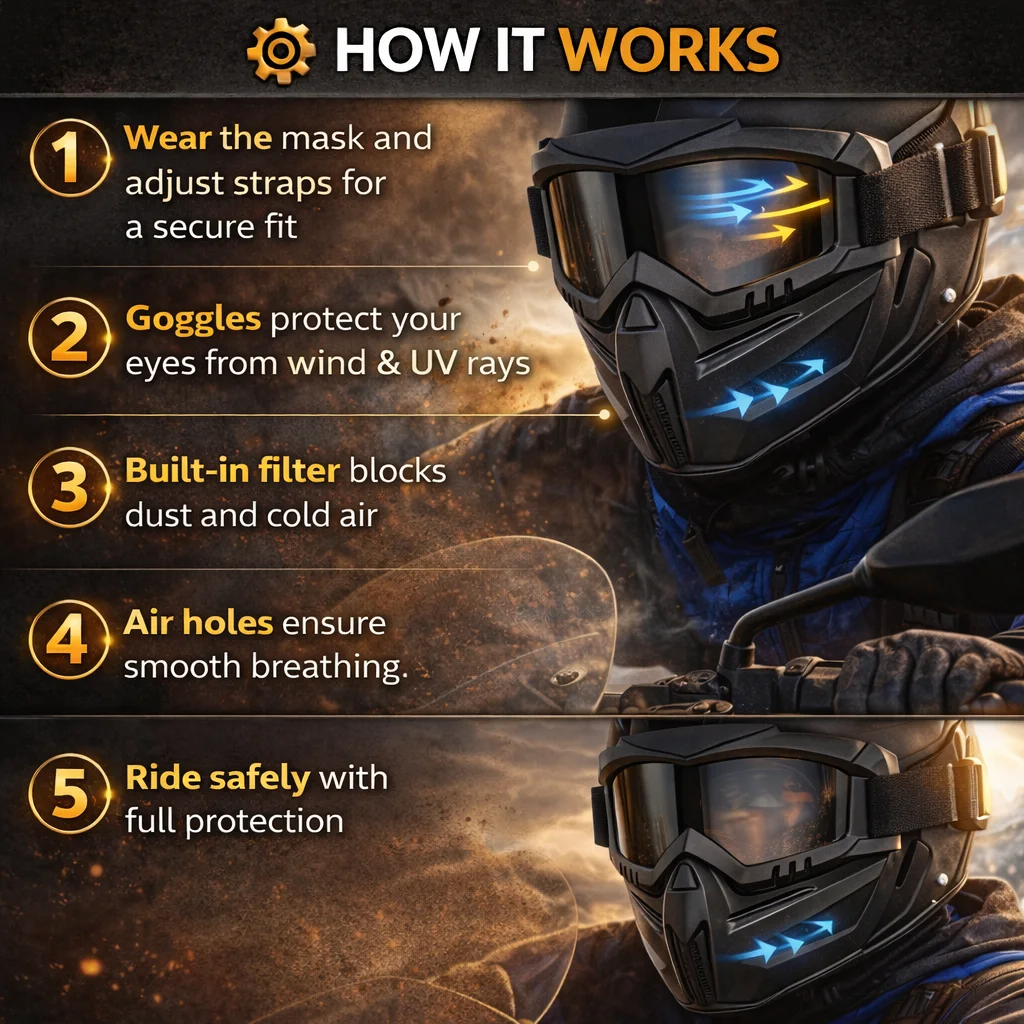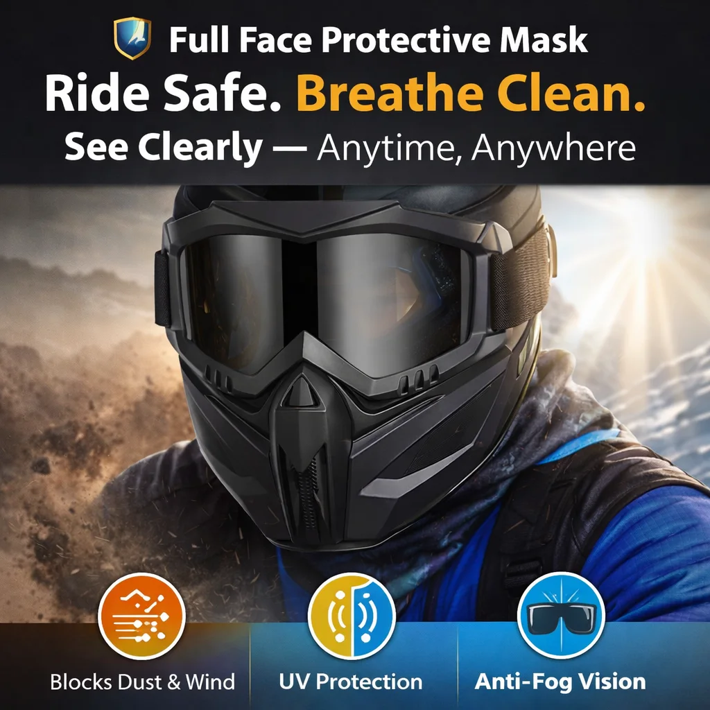 Protect your face, eyes, and lungs in one powerful solution. This all-in-one protective mask shields you from dust, wind, cold air, and harmful UV rays — while keeping your vision crystal clear